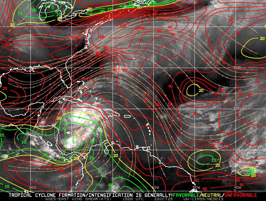 L’Ouragan Catégorie 5 MELISSA situé(e) sur 17.9 N par -77.9 W (à 118 km à l’Ouest de Jamaica). L’intensité est de 160 kts et la pression de 892 hPa.