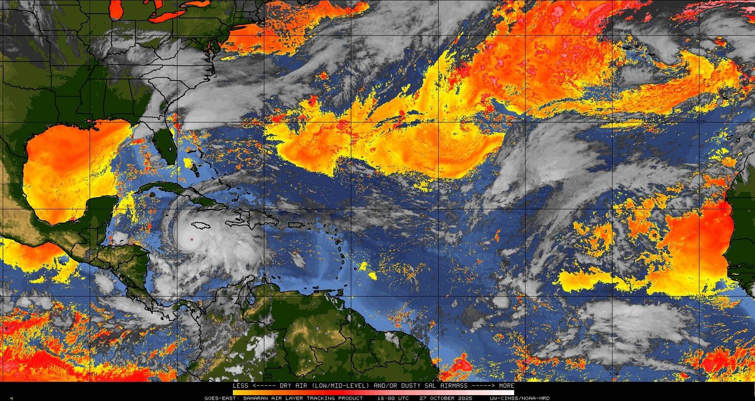 L’Ouragan Catégorie 5 MELISSA situé(e) sur 16.4 N par -78.2 W (à 232 km au SO de Jamaica). L’intensité est de 145 kts et la pression de 908 hPa.