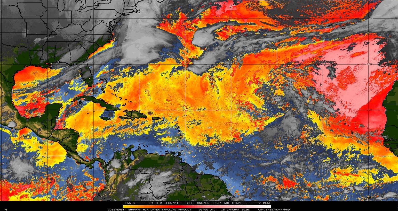 Il n’y a pas de cyclone ni de système surveillé par le NHC en Atlantique. Nous ne sommes pas actuellement en période cyclonique