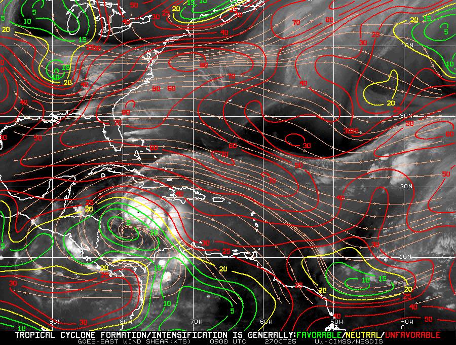L’Ouragan Catégorie 4 MELISSA situé(e) sur 16.3 N par -77.7 W (à 212 km au SSO de Jamaica). L’intensité est de 135 kts et la pression de 924 hPa.