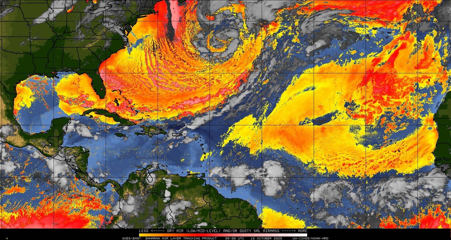 – L’onde numéro 1 est située sur 11.68 N par -47.07 W (à 1372 km à l’Est de Barbados). Le risque de renforcement est de 0% à 48H et de 30% à 7 jours.
