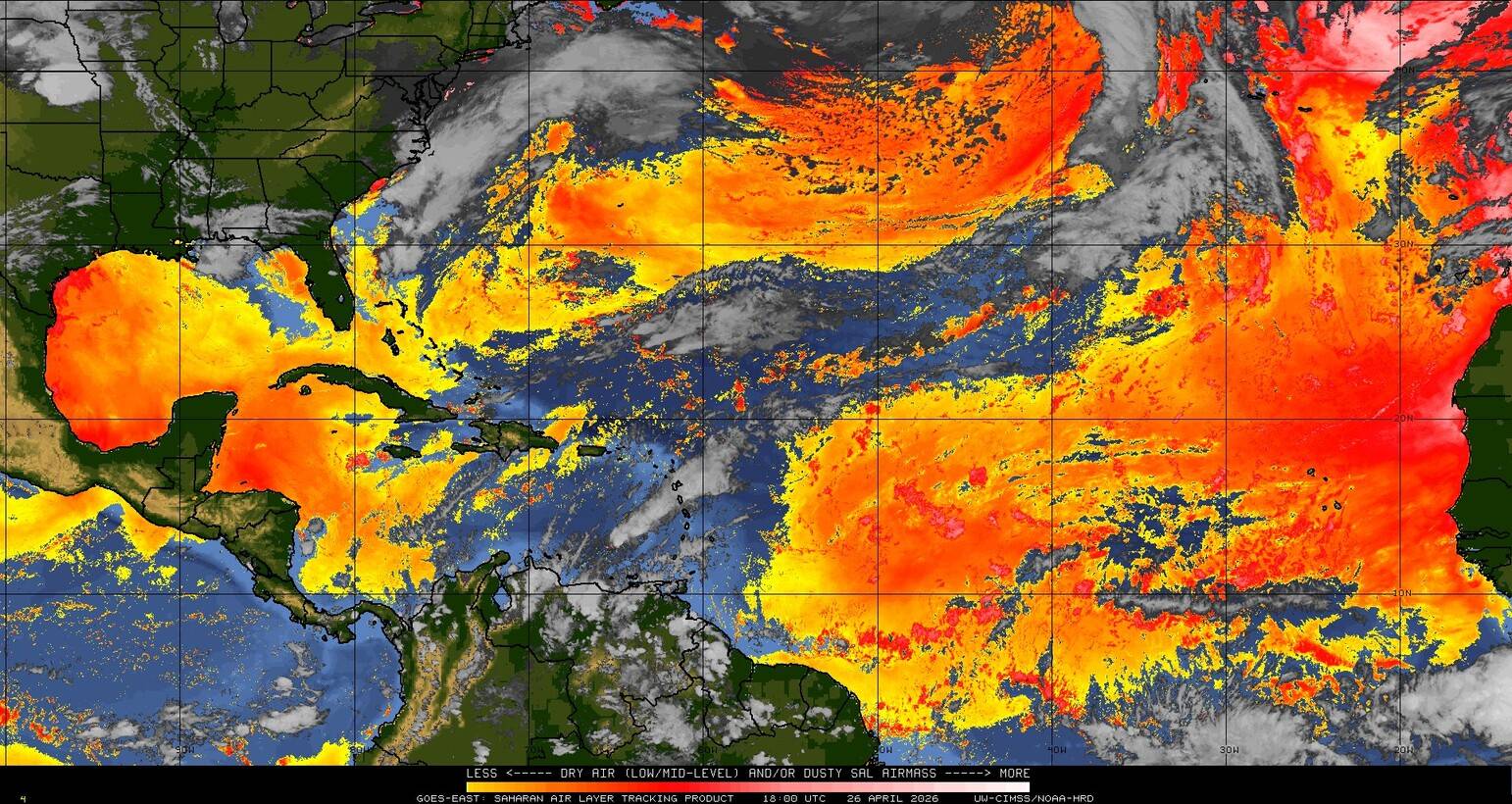 Il n’y a pas de cyclone ni de système surveillé par le NHC en Atlantique. Nous ne sommes pas actuellement en période cyclonique