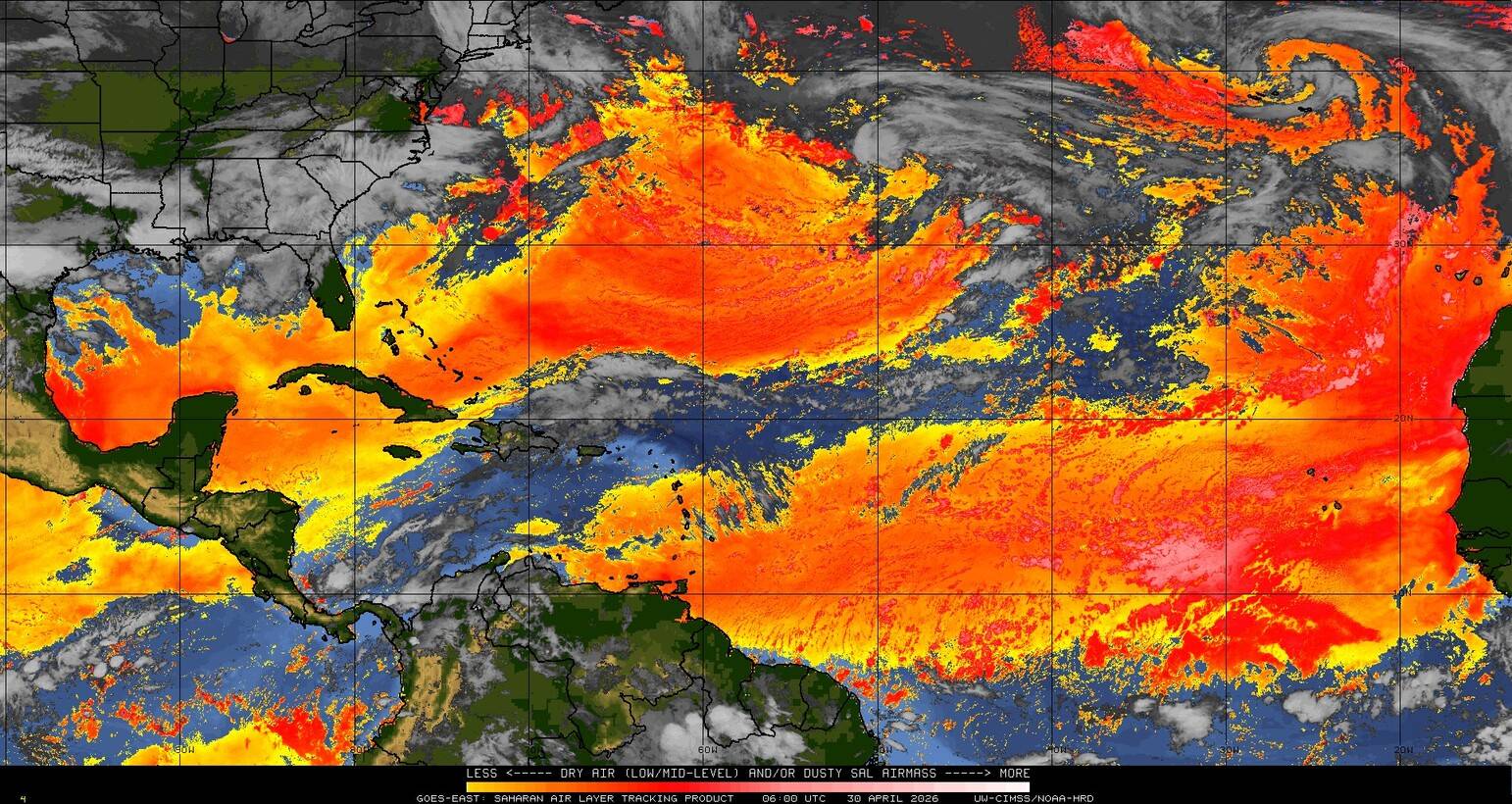Il n’y a pas de cyclone ni de système surveillé par le NHC en Atlantique. Nous ne sommes pas actuellement en période cyclonique