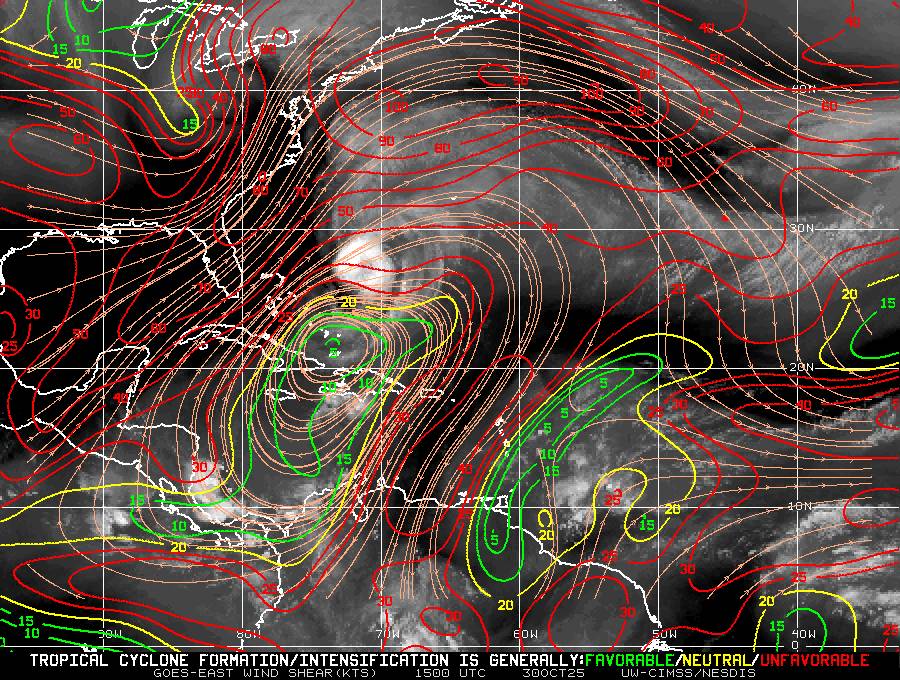 L’Ouragan Catégorie 2 MELISSA situé(e) sur 26.7 N par -72.7 W (à 499 km à l’ENE de Bahamas). L’intensité est de 90 kts et la pression de 965 hPa.