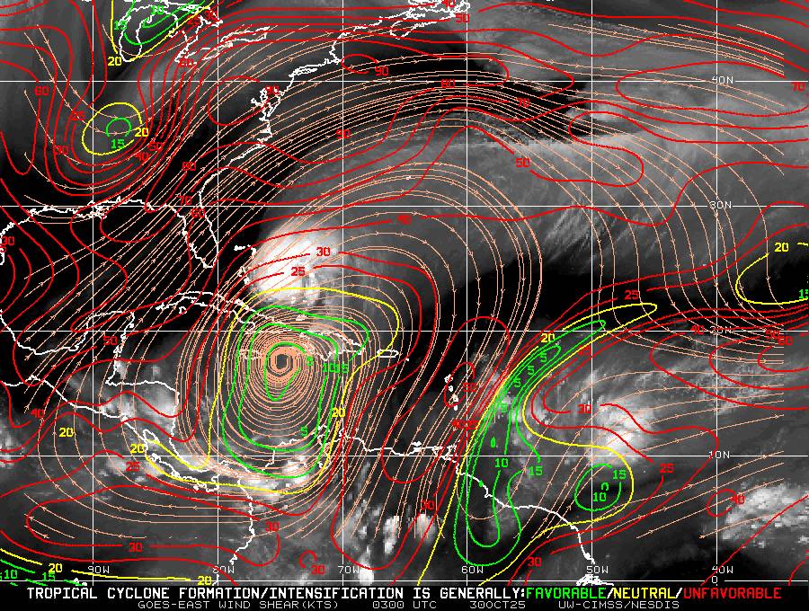 L’Ouragan Catégorie 1 MELISSA situé(e) sur 23.5 N par -74.8 W (à 311 km à l’ESE de Bahamas). L’intensité est de 80 kts et la pression de 970 hPa.