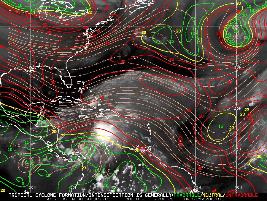 La Tempête MELISSA situé(e) sur 14.4 N par -73.6 W (à 480 km au SSO de Haiti). L’intensité est de 45 kts et la pression de 1000 hPa.