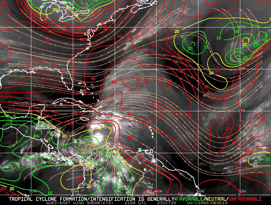 La Tempête MELISSA situé(e) sur 15.5 N par -75.3 W (à 320 km au SSE de Jamaica). L’intensité est de 40 kts et la pression de 1001 hPa.