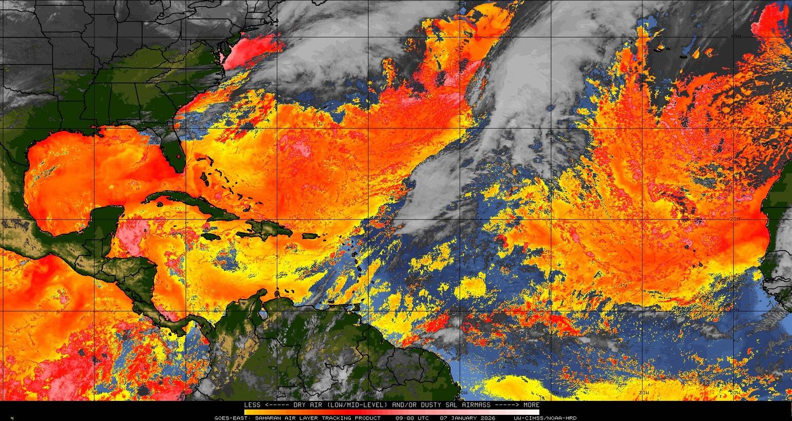 Il n’y a pas de cyclone ni de système surveillé par le NHC en Atlantique. Nous ne sommes pas actuellement en période cyclonique