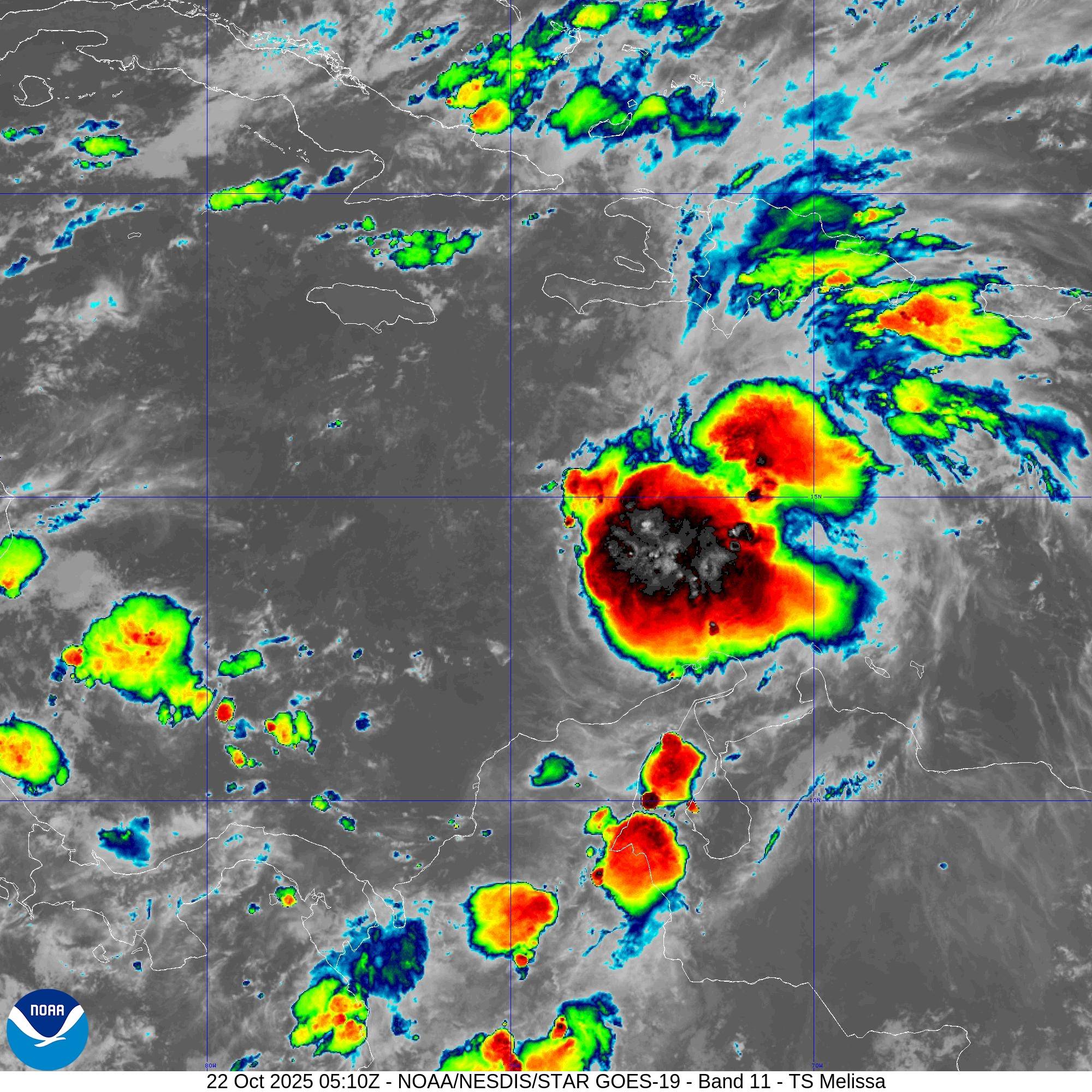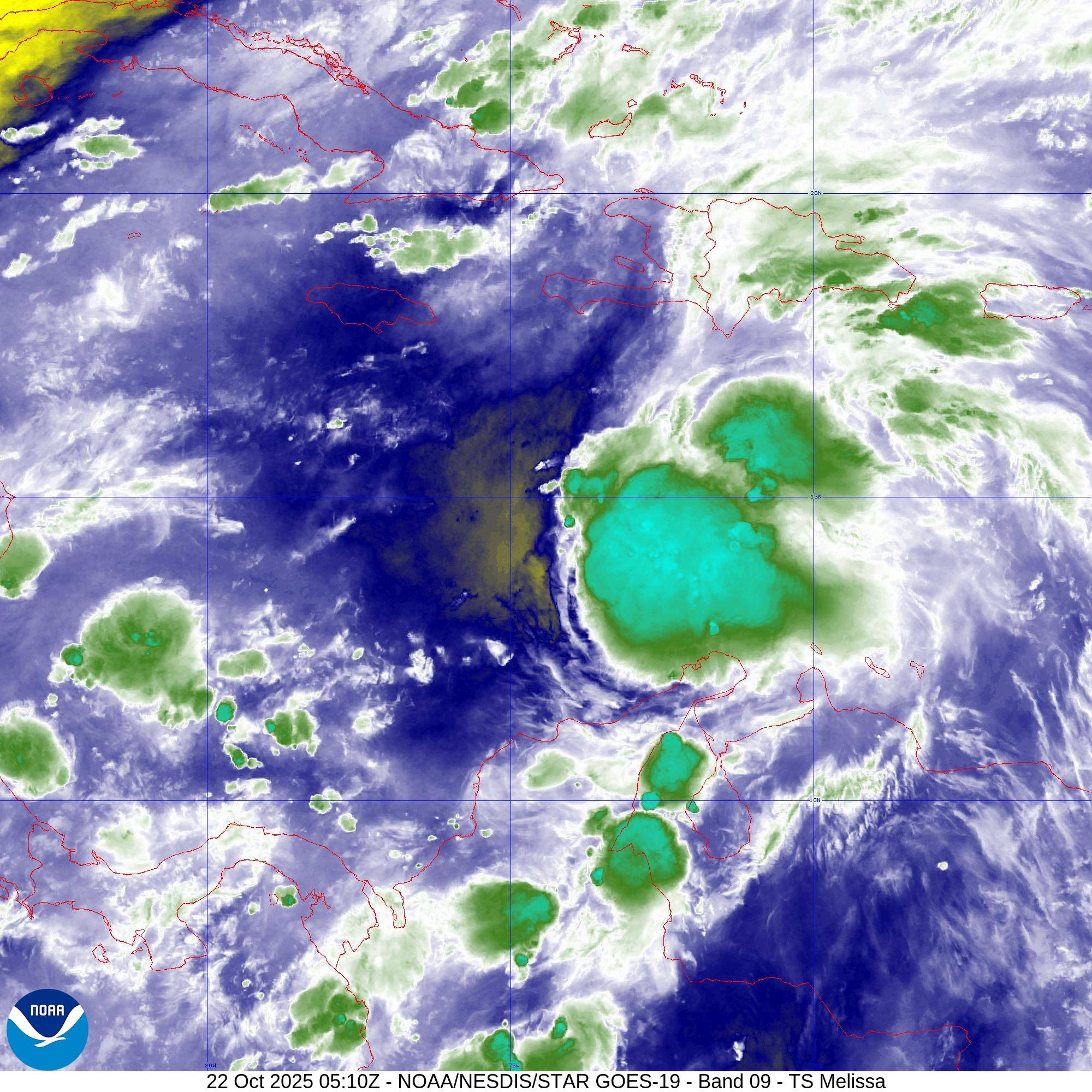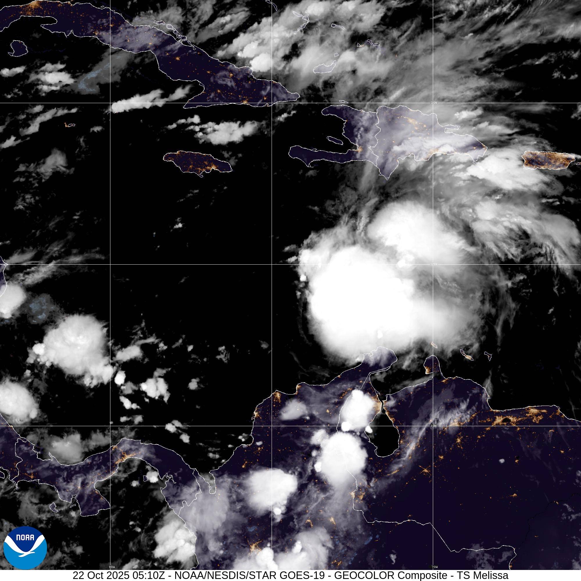 La Tempête MELISSA situé(e) sur 14.2 N par -72.7 W (à 470 km à l’ONO de Aruba, Bonaire, Curacao). L’intensité est de 45 kts et la pression de 1003 hPa.