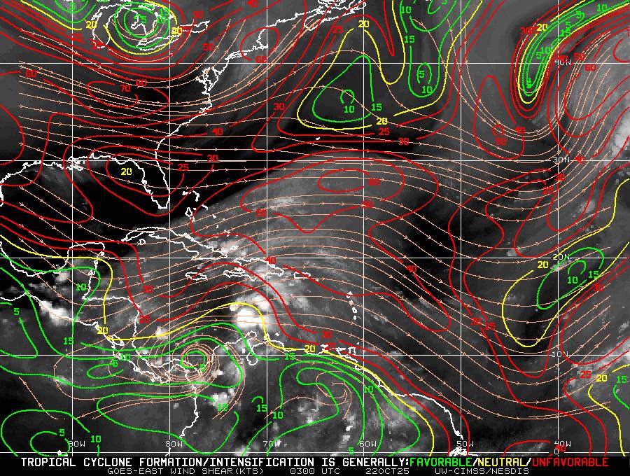 La Tempête MELISSA situé(e) sur 14.2 N par -73 W (à 488 km au Sud de Haiti). L’intensité est de 45 kts et la pression de 1003 hPa.