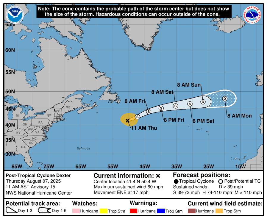 Le Thursday 7 August à 15h UTC, DEXTER est situé(e) sur 41.4 N par -50.4 W (à 1628 km à l’ENE de Bermuda). Son intensité est de 50 kts et sa pression de 998 hPa. Sur les dernières heures, le système s’est déplacé à 16 km/h à l’ENE. Le vent et la pression sont stables .