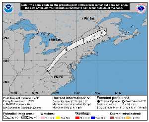 NICOLE est le 17e cyclone de la saison 2022. Il est apparu en Atlantique le 06/11/2022 et a eu une durée de vie de 5 jours(s) et 6 heure(s). Il a directement impacté les territoires suivants : . Son intensité maximale a été de 65kt soit Ouragan Cat.1.