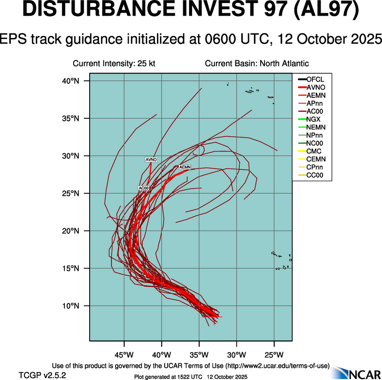 Le Sunday 12 October à 12h UTC, INVEST 97L est situé(e) sur 10 N par -34.8 W (à 2725 km à l’Est de Barbados). Son intensité est de 25 kts et sa pression de 1008 hPa. Le risque de renforcement est de 40% à 48H et de 50% à 7 jours. Sur les dernières heures, le système s’est déplacé à 43 km/h au NW. Le vent et la pression sont stables .