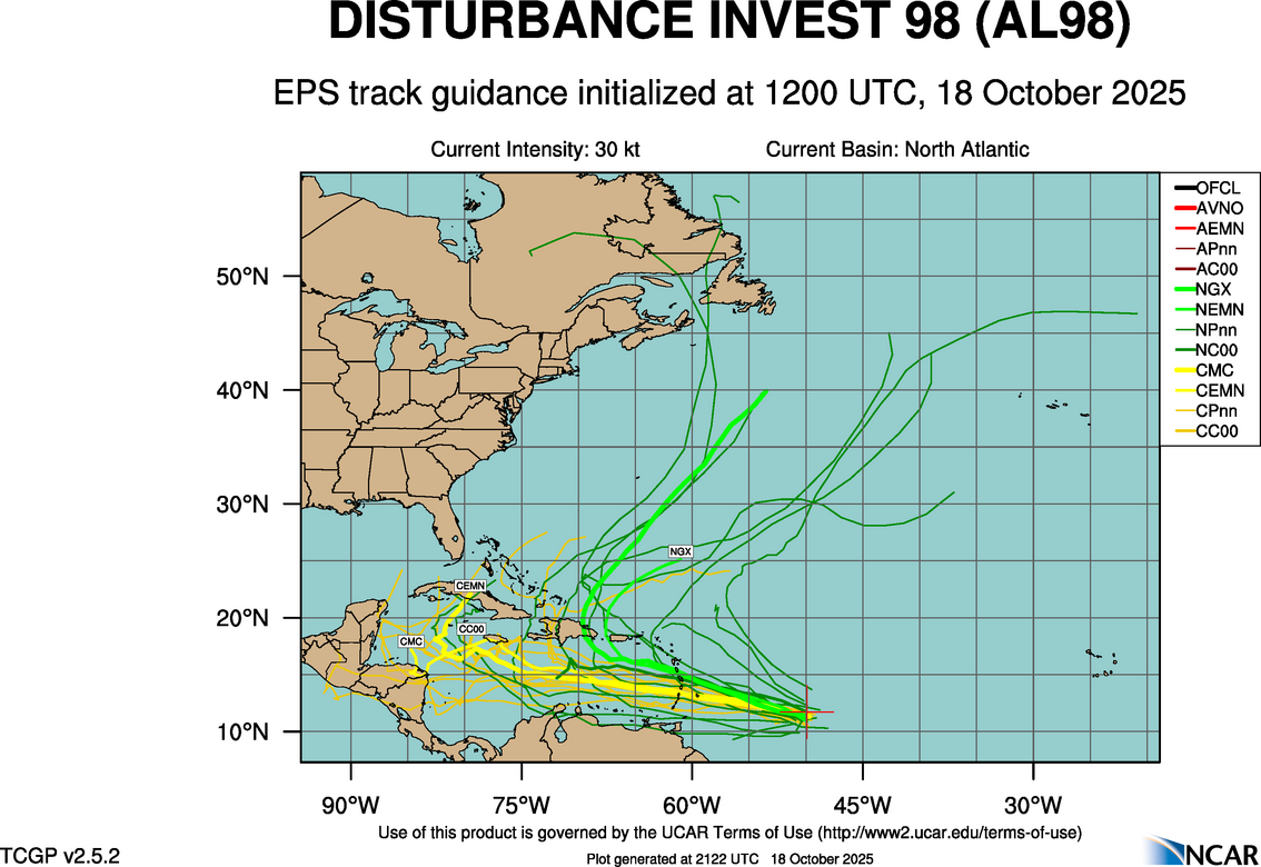 Le Saturday 18 October à 18h UTC, INVEST 98L est situé(e) sur 12.4 N par -52.8 W (à 744 km à l’Est de Barbados). Son intensité est de 30 kts et sa pression de 1010 hPa. Le risque de renforcement est de 10% à 48H et de 30% à 7 jours. Sur les dernières heures, le système s’est déplacé à 54 km/h à l’ONO. Le vent est stable et la pression est en baisse de 1 hPa.